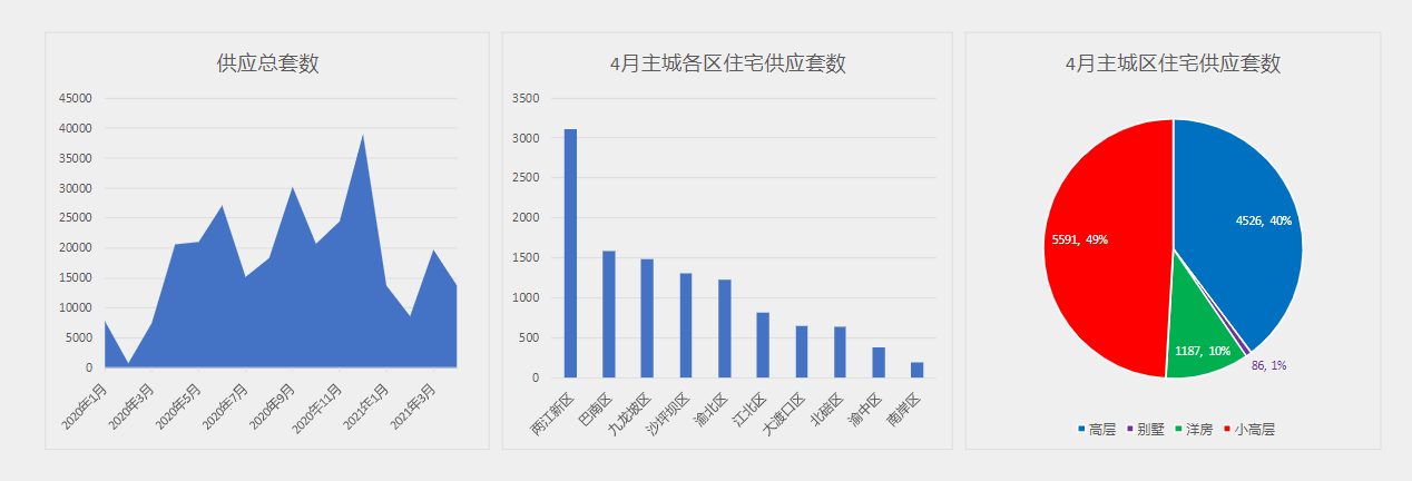 2021年4月新增住宅11390套,較年同期減少5266套,較上月減少2000套,其中高層4526套,小高層5591套、洋房1186套、別墅86套。擬售備案單價(套內)10000元/平方米以下占比約2%,10000-15000元/平方米占比約30%,15000-20000元/平方米占比約39%,20000-25000元/平方米占比約16%,25000元/平方米以上占比約13%。本月預售許可住宅項目主要集中的行政區(qū)為兩江新區(qū)。