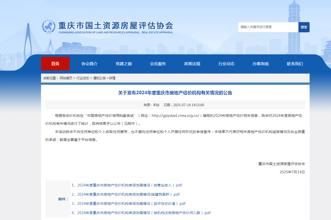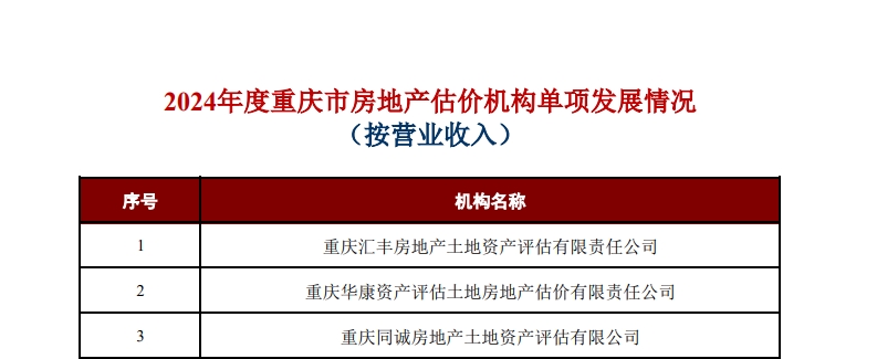 重慶市國(guó)土資源房屋評(píng)估協(xié)會(huì)于2025年7月14日發(fā)布《2024年度重慶市房地產(chǎn)估價(jià)機(jī)構(gòu)發(fā)展情況公告》。數(shù)據(jù)顯示,重慶匯豐房地產(chǎn)土地資產(chǎn)評(píng)估有限責(zé)任公司在2024年度重慶市房地產(chǎn)估價(jià)機(jī)構(gòu)單項(xiàng)發(fā)展情況(按營(yíng)業(yè)收入)中排名位列第1名。